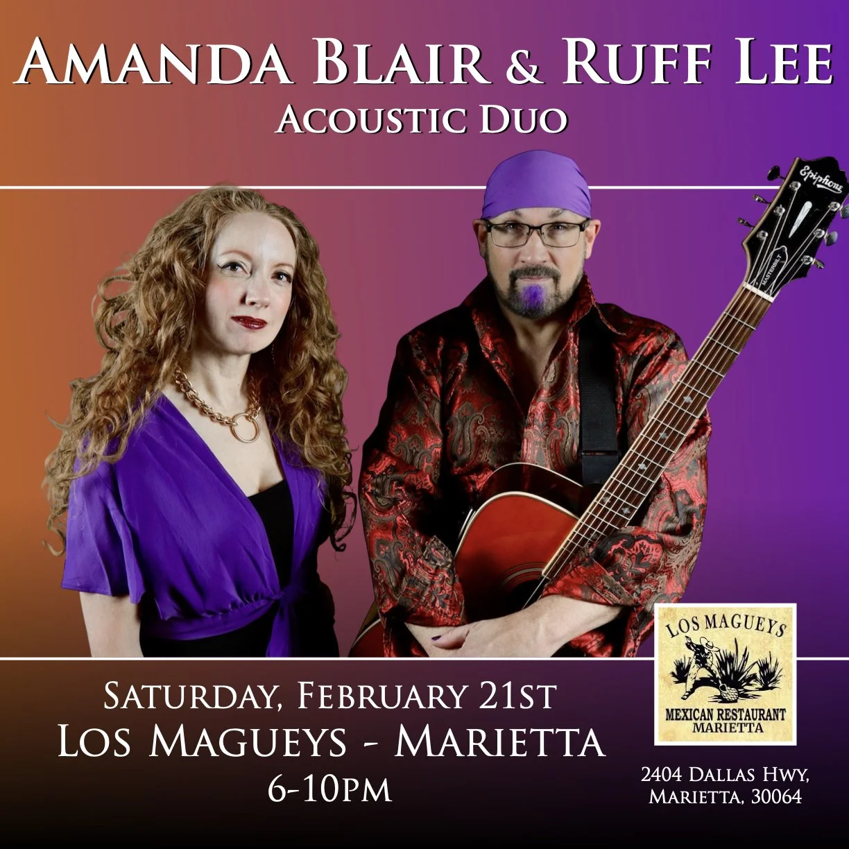 Ruff & Amanda Acoustic Duo at Los Magueys Marietta Saturday, February 21, 2026 6:00 PM 10:00 PM Los Magueys - Marietta 2404 Dallas Highway Marietta, GA, 30064 United States (map) Google Calendar ICS